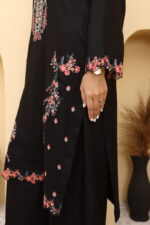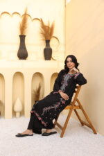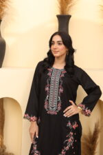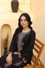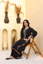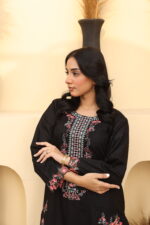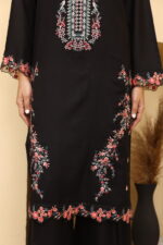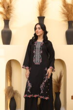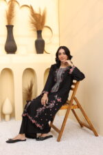 This elegant BLACK 2PCS outfit is crafted from soft, breathable fabric with beautifully detailed embroidery on the front neckline, sleeves, and hem. The straight-fit kurta gives a graceful and comfortable look, paired with wide-leg trousers for easy movement and everyday style. A refined choice for both casual and semi-formal wear.