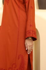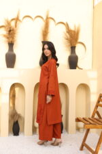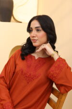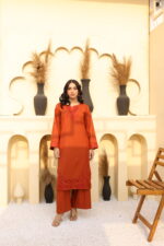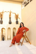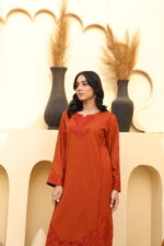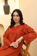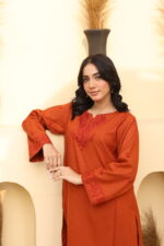 This elegant Rust 2PCS outfit is crafted from soft, breathable fabric with beautifully detailed embroidery on the front neckline, sleeves, and hem. The straight-fit kurta gives a graceful and comfortable look, paired with wide-leg trousers for easy movement and everyday style. A refined choice for both casual and semi-formal wear.